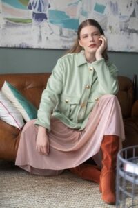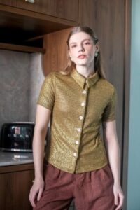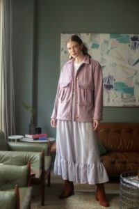 Entre os outros destaques da coleção estão: shacket em veludo cotelê com modelagem ampla e bolsos utilitários; jaqueta retrô estruturada com forro interno; calça reta em tecido leve com pregas frontais; vestido midi bicolor com busto estruturado e saia godê; bata com botões de pérola e recorte franzido; e saia longa fluida com franzido e babado.