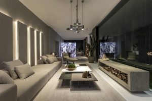 Todo o espaço conta com diversas texturas. “Na minha opinião, isso traz aconchego a qualquer tipo de projeto”, comenta Luciana, que usou linho, veludo, couro natural, camurça, pedra, vidro, aço com microtextura. “Usamos, também, tonalidades de cinza, além de um pequeno toque rosé, pois no filme a robô tem uma poltrona nesse tom no ambiente onde vive”, completa Luciana. No mobiliário estão o módulo Escape, em linho Ratier Boucle Montreal cor Neblina (lançamento Artefacto), as poltronas e pufes Lounger em couro natural grafite, e a mesa componível Carlo, com acabamentos se misturam harmonicamente. Para o ambiente do robô Ava, o sofá Illi em veludo cinza, a mesa de apoio Trevi e a enorme mesa Kham – usada como escrivaninha – se unem a cadeira Chiara e o espelho Elie para dar o toque futurista que o filme sugere. “A ideia é refletir ao máximo a iluminação natural”, conta Luciana.