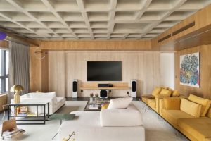 Neste living integrado, Priscilla Müller seleciona itens de décor que promovem conforto e elegância, premissas básicas do “Quiet Luxury”. A escolha de elementos claros e monocromáticos – como o tapete desenhado pela arquiteta e executado pela Botteh Handmade Rugs -, em conjunto com os acabamentos amadeirados do mobiliário, são peças fundamentais para marcar o estilo clean e atemporal do espaço.