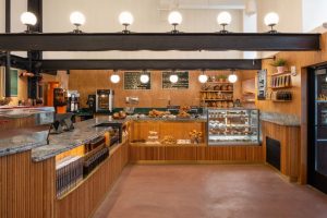 Para a GRT Architects, era crucial conciliar o ambiente acolhedor com a cozinha industrial. “Ao longo do processo de projeto, procuramos maneiras de preservar o caráter único do espaço enquanto construímos uma cozinha comercial de última geração visível para os clientes do café durante todo o dia. Além disso, selecionamos a cerejeira pela sua cor e pelas variações naturais de cor inerentes à madeira”, disseram os arquitetos.
