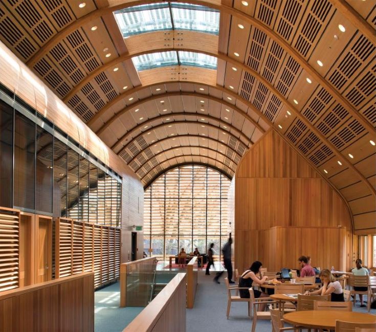 O prédio, que apresenta escadas e revestimentos das paredes internas em carvalho vermelho que contrastam com o concreto da construção, contou com madeiras da própria floresta da Yale, em Connecticut, manejadas de forma sustentável.