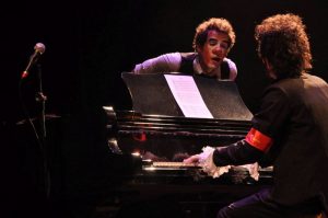 O público, aliás, é parte fundamental da trama, pois é convocado pelo palhaço Sarrafo [1]para fazer o papel de coral no concerto atrapalhado. Sarrafo é vivido por Felipe Ternes, que também assina a direção artística da montagem. Cabe a ele ainda os números de malabarismo e dança. A direção musical é de Vander Brock, e ele também mostra seu talento múltiplo tocando vários instrumentos no espetáculo[2], como piano, violão, acordeom, gaita e harmônica.