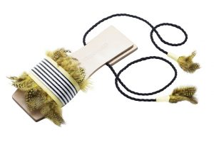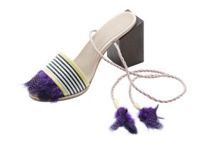 A linha conta com três modelos nas cores amarelo, roxo e pink: a tradicional flat quadrada, e dois tamanhos de salto – o mais baixo, redondo e o mais alto, quadrado. As peças são feitas de couro, madeira abaulada, plumas de galinha D’Angola e cordão São Francisco.