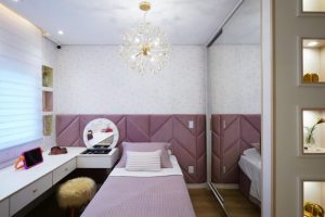 No quarto da filha foi desenvolvido um projeto totalmente novo, adaptado à sua idade e necessidades. E utilizada a cor preferida dela, o rosa, para criar um ambiente acolhedor e bonito, com bancada, penteadeira camarim e um painel de TV, além de uma linda cabeceira com iluminação indireta.