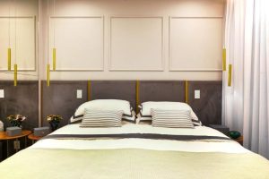 No quarto do casal, apenas o espelho que ficava em uma das paredes foi mantido para dar mais amplitude. A designer de interiores o modernizou com iluminação e boiserie. A decoração ficou ainda mais acolhedora com uma linda cabeceira em serralheria dourada e iluminação indireta, que foi complementada por cortineiros iluminados.
