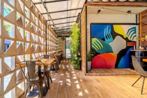 Conhecido por valorizar materiais naturais e soluções que priorizam conforto ambiental, Marcos parte da essência do Fresh&Co., comida saudável e descomplicada, para conceber um ambiente leve, iluminado e acolhedor. A iluminação e ventilação natural são protagonistas do projeto. A luz do dia percorre os salões e ressalta texturas, enquanto as aberturas garantem circulação de ar e conforto térmico.