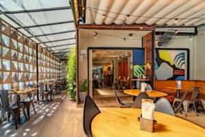 Um dos destaques do projeto é o painel laranja com inspiração em container, que abriga a área de dispensa. O elemento cria contraste e dinamismo, dialogando com a estética setentista e com o conceito urbano do restaurante. A madeira de restauro aparece em diferentes pontos, trazendo história e sustentabilidade ao espaço, enquanto o tijolo aparente reforça a linguagem acolhedora e autêntica.