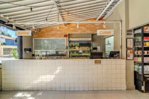 Durante o processo de reforma, o arquiteto também decidiu valorizar elementos estruturais da casa original. Em alguns pontos, os tijolos foram mantidos aparentes, revelando o sistema construtivo da década de 1970 e convidando o visitante a perceber a história da edificação como parte da experiência do espaço.A escolha criteriosa de materiais reforça a assinatura do arquiteto. O piso da Portinari garante unidade visual e resistência, enquanto o azulejo Mica no balcão de atendimento adiciona textura e delicadeza. As bancadas com cortiça trazem aconchego e reforçam o compromisso com materiais naturais.
