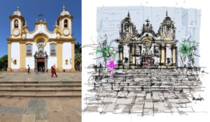 Igreja Matriz de Santo Antônio, considerada uma obra-prima do barroco mineiro e a mais antiga de Tiradentes: à esquerda, a foto realizada por Mariana Orsi e, à direita, o desenho realizado por José Ricardo Basiches. Essa é uma das obras que compõem a exposição Ecos Tiradentes