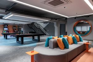 Outra preocupação das empresas passa a ser com o bem-estar dos colaboradores e a arquitetura também pode colaborar para garantir um bom espaço de trabalho. Espaços de descompressão acabam sendo indispensáveis, trazendo um pouco do home para o office. “Foi o que pensamos no projeto da fintech GerenciaNet, em que investimos em um ambiente mais leve e descontraído em toda a extensão do escritório. Bem como um espaço de descompressão, que conta com jogos e videogames”, revela Marília Veiga. Não para menos, o escritório foi certificado com o selo Great Pleace to Work.