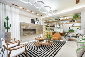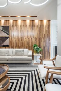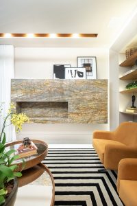 Um dos destaques é a sala de estar. Assinada pela designer de interiores Cristina da Luz, a profissional quis mostrar que é possível obter contemporaneidade em qualquer espaço, dando ênfase aos padrões que remetem à natureza, como madeira e mármore.