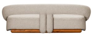 “O grande gesto de design da coleção está no desenho das costas do sofá, onde uma linha central organiza e conduz visualmente toda a peça. Esse elemento percorre o encosto e desce até a base, conectando-se a uma estrutura em madeira que sustenta o conjunto”, diz Marta Manente.