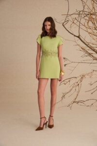 Entre os materiais utilizados, ganham protagonismo o Chevron — tecido encorpado, com trama característica, perfeito para o alto inverno — e o Crepe Patou, clássico da marca, que une elegância e um toque minimalista às criações. As peças também exploram o mix de rendas — com soutache, renascença e telas geométricas — reforçando o DNA artesanal da marca. A organza aparece como base etérea para bordados minuciosos com miçangas, enquanto o satin silk confere leveza e sofisticação às composições. Já o tafetá, presente em versões vermelho carmim e preto, traduz imponência para ocasiões especiais.