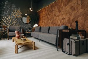 Predominando o cinza, preto e tons terrosos, as profissionais Olga Bergamini e Karin Neitzke desenvolveram um living com inspiração industrial. A vitrine da Masotti Curitiba tem a essência contemporânea, com um olhar atual destacando o mobiliário da loja e o revestimento da parede principal.