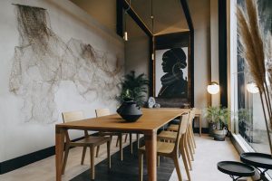 A mesa de jantar é o grande destaque da vitrine assinada pela dupla Tatiana Ravache e Laura Ribas, do escritório Arq TL. Com linhas curvas e a contemporaneidade como essência, as profissionais escolheram a Mesa Moema, da Masotti Curitiba, para compor o espaço. O projeto conta com tons de cimento queimado nas paredes e parte do piso, seguido da madeira e pontos de preto. O tom de amadeirado quente aqueceu o ambiente trazendo mais aconchego ao espaço.