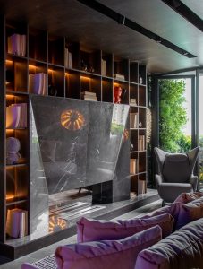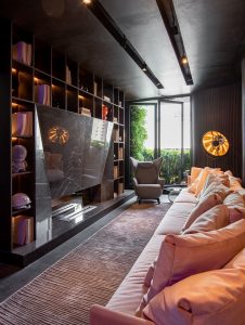 As linhas curvas trazem uma sensação intimista com a presença de uma marcenaria protagonista. As paredes são feitas de um ripado de madeira Trancoso da Duratex e foi o grande desafio na execução do projeto. “Queria trazer uma sensação nova iorquina com a presença de muita madeira e da grande lareira. É um espaço incrível para curtir no outono e no inverno”, conta Lima. Pisos, estantes e paredes também são envolvidos por itens de uma marcenaria impecável.