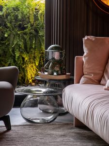 O mobiliário escolhido apresenta design clean e cheio de personalidade. Um dos principais destaques é o sofá em um tom de rosa bem suave, além de ser a maior peça da sala, ele confere leveza ao ambiente, ideal para contrapor toda a atmosfera “dark” e masculina do espaço.
