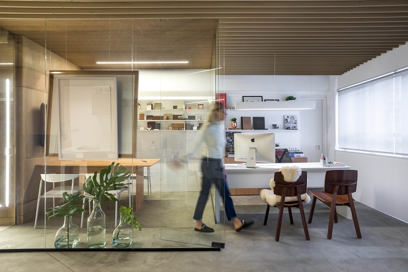 O piso de cimento queimado promove uma sensação de unicidade ao ambiente, que ganha pontos de cor com plantas na sala de reunião e pequenos detalhes nas prateleiras. A iluminação natural também é um dos pontos altos do projeto, explorada com o uso das grandes janelas do espaço.