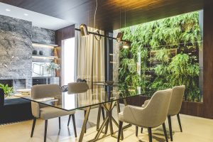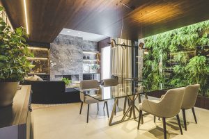 Seguindo o tema “o essencial para morar bem”, a profissional revestiu todas as paredes e o teto do ambiente com o padrão madeirado, que remete à tradicional árvore brasileira Imbuia. O painel compõe com uma paleta de cores sóbrias e elementos como um jardim de inverno e a lareira revestida em pedra natural. Vale o destaque também para o sofá curvo, que integra e acolhe o longe.