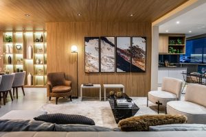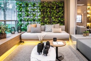As áreas sociais são totalmente integradas, revelando a essência do lar: um espaço ideal para reunir familiares e amigos para desfrutar bons momentos. O terraço gourmet abusa do conceito de design biofílico com a estrutura metálica planejada para abrigar diversos vasos, formando uma espécie de parede viva. O MDF Savana aparece na bancada, com lareira embutida, no sofá e na mesinha de centro.