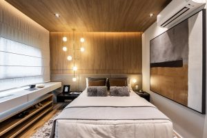 A linguagem unificada se estende por toda a área íntima. Com presença marcante, o MDF torna os ambientes ainda mais aconchegantes. Na suíte máster, o material se integra com um mix de texturas e tecidos. No banheiro do cômodo, o painel ripado é protagonista e, junto às pedras naturais, torna o espaço perfeito para um momento de autocuidado e relaxamento.