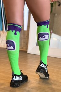 “Um look all black pode ser combinado com meiões coloridos ou neon. Nesse caso, o ponto focal da produção será a meia divertida. Já um look colorido pode levar um meião em que sua cor combine com uma das cores da estampa. Se o look tiver uma estampa tie dye predominantemente verde por exemplo, você pode colocar um meião em qualquer tom de verde”, orienta a consultora de moda.