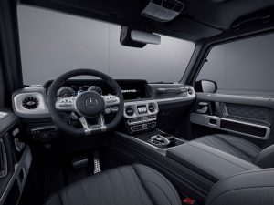 Seu interior também é definido pelo contraste entre preto e dourado. Ao entrar, os emblemas “AMG” nas soleiras das portas na cor preta, com bordas iluminadas são rapidamente identificados. Os bancos têm acabamento em couro napa preto “G Manufaktur” e costuras contrastantes. Placas com o logotipo AMG dourado e bordas douradas são colocadas nos encostos. Os tapetes também têm acabamento em preto e costuras douradas. Outros itens do acabamento interno estão presentes em carbono com detalhes na cor cobre. O volante AMG Performance em microfibra DINAMICA apresenta a inscrição “G 63”.
