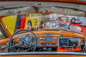 Atmosfera de trabalho: Itens de série, como os detalhes de madeira, continuam a testemunhar o posicionamento do Mercedes-Benz 300 como um veículo luxuoso. O assento de Adenauer, do lado direito traseiro, porém, irradia uma autêntica atmosfera de trabalho: atrás da divisória, que tem um vidro com acionamento elétrico, há uma pequena mesa dobrável que pode ser usada para realizar tarefas. Uma persiana de rolo acionada por cabo foi instalada para escurecer a janela traseira e proteger os ocupantes da luz do sol – o veículo do chanceler não tinha ar-condicionado. Havia, porém, um ventilador de três pás instalado acima do assento do governante, para garantir uma brisa refrescante. A tecnologia de comunicações do sedã 1959 era ultramoderna: o porta-luvas ocultava uma versão pioneira de telefone móvel.