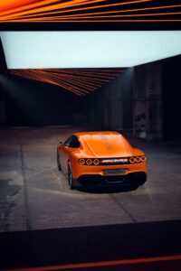 Com sua silhueta dinâmica fastback, capô longo e baixo e para-brisa fortemente inclinado, o CONCEPT AMG GT XX é uma afirmação clara da performance esportiva característica da marca. O esquema de cores ousado em “sunset beam orange” transmite autoconfiança.