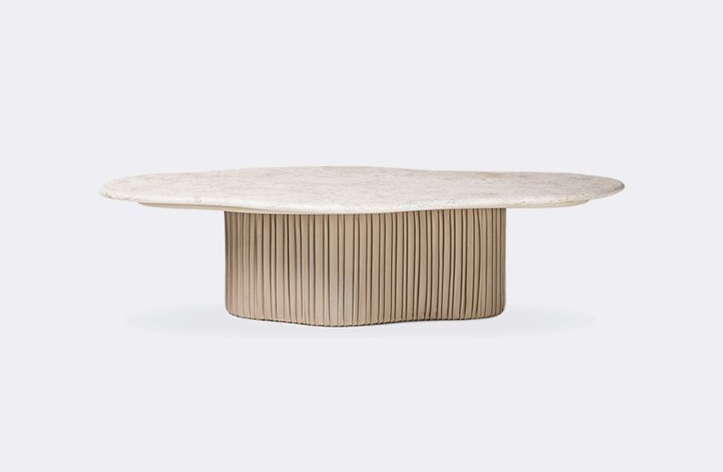 Mesa de Centro Orion: Com a combinação de materiais que unem design e moda, a mesa de centro Orion transforma o espaço em narrativa sensorial e visual. O tampo em mármore de contorno orgânico revela a beleza única da pedra natural, já a base, revestida em couro plissado, traz um contraste entre rigidez e fluidez, reforçando o aspecto artesanal da peça.