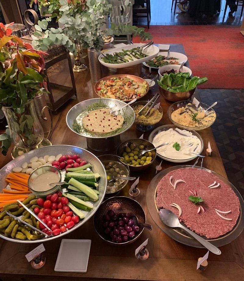 A cada almoço no final de semana, cardápios variados, uma mistura de receitas tradicionais com outras que poderão variar respeitando a sazonalidade e valorizando o pequeno produtor rural. Uma enorme variedade de pratos árabes com os clássicos presentes — esfirras, quibes quentes e crus, suculentas caftas de cordeiro, todas as pastas ou mezzes, saladas variadas, falafel, couscous, arroz com lentilha e aletria e por aí vai. Pratos típicos libaneses servidos em sistema de buffet em uma mesa central no restaurante. Vale dizer ainda que as sobremesas fazem parte do menu, como o pudim de pistache e a baklawa.