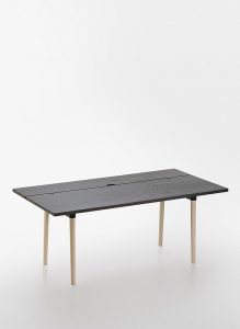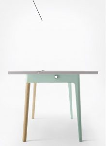 A mesa tem uma fenda que separa as duas partes, o que permite instalar cabos, suportes para lâmpadas, separadores e vários outros acessórios. Desse modo, o que poderia ser mais uma mesa do dia a dia, se transforma facilmente em um espaço de trabalho que pode ser plenamente utilizado para outras funções.