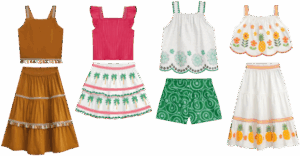 Com um apelo diferente, mas compartilhando os mesmos ideais e valores, as peças exploram aviamentos manuais, babados, modelagens diferenciadas e estampas exclusivas que remetem à fauna e flora, como abacaxis e folhagens tropicais. A cartela de cores passeia entre tons vibrantes, como laranja, verde e amarelo, e os terrosos que estão em alta, permitindo composições que valorizam tanto o frescor infantil quanto a autenticidade nos looks.