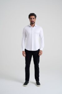 Do ponto de vista técnico, o diferencial está no tecido de malha premium, que oferece toque macio, elasticidade natural e alta respirabilidade. A construção garante melhor regulação térmica, conforto prolongado mesmo em jornadas longas e mobilidade sem restrições. Além disso, a peça não amassa com facilidade, tem secagem rápida e reduz a necessidade de passar, características especialmente valorizadas por quem viaja com frequência ou mantém uma rotina dinâmica. Os acabamentos reforçam o visual social clássico, com gola estruturada, costuras limpas e caimento mais organizado, sem marcar excessos de volume corporal.