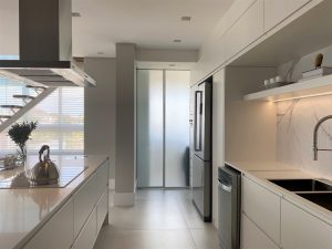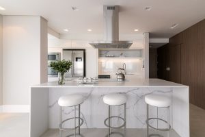 Assim, concebeu um ambiente elegante e atemporal, para os donos poderem receber amigos e familiares e aproveitarem ao máximo os momentos em casa. “A palavra que norteou todo o projeto foi minimalismo. Há predomínio de formas retas e elegantes, cores claras e pouca ornamentação”, explica a arquiteta.