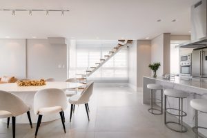 A planta livre, com integração entre os ambientes, priorizando o convívio, é uma das particularidades desse apartamento de 280m², que tem entre os destaques um terraço gourmet com piscina e vista panorâmica da cidade. A escada de madeira que leva a essa área de lazer, o grande painel de madeira que abraça o hall de entrada e a iluminação natural também chamam a atenção. Tudo é pontuado por uma linguagem contemporânea, porém sem excessos, e pela funcionalidade e elegância do mobiliário.