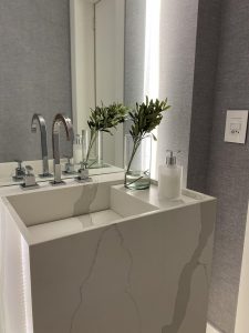 O tom elegante e minimalista adotado pela arquiteta segue também no lavabo. Para esse ambiente, ela escolheu metais Meber, mais especificamente o misturador de lavatório Athena Slim (bancada 1877 C 35), de design moderno e sofisticado. “A Meber tem qualidade conhecida, funcionalidade e design elegante e diferenciado, combinando perfeitamente com a cuba esculpida em pedra”, diz Bárbara.