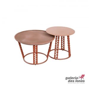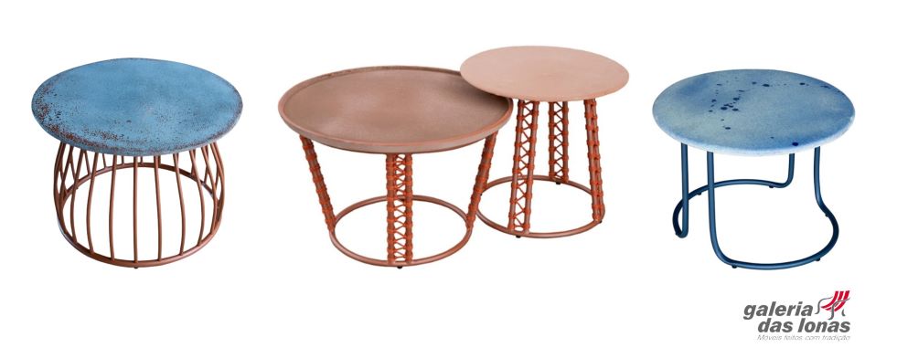 O charme fica por conta do acabamento em corda náutica, ou mesmo no próprio metal, e o tampo em cerâmica artesanal. As cores são escolhidas pelo cliente e, graças ao design, estas mesas também podem ser utilizadas para compor a decoração de ambientes internos.