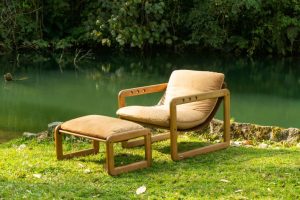 A linha Luna traz como referência as fases da lua. O sofá e a poltrona são pensados para espaços com menores metragens, como áreas gourmet ou varandas cobertas. A natureza ainda é reforçada pela silhueta dos braços em madeira com acabamento rústico, produzido com técnicas artesanais, e construção suspensa que traz leveza.