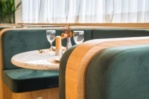 O restaurante tem a mesma paleta de cores da entrada do hotel, com pontos de cor nos tecidos de veludo verde que compõem os bancos fixos em um inusitado formato curvo, feitos em lâmina natural de carvalho. Eles foram projetados em um formato que favorece a aproximação e o acolhimento, duas das grandes propostas do QOYA, e vêm acompanhados de uma mesa redonda com tampo de mármore branco Paraná no centro. “É uma cor bem arrojada, mas que combina perfeitamente com a forma orgânica dos móveis”, fala Eleandro Miranda, diretor de Marketing e Novos Produtos da empresa. O mesmo mármore também aparece na bancada da área de bufê, sobre a marcenaria da Mobitec. As demais mesas em mármore do restaurante receberam linhas curvas com acabamento bisotado.