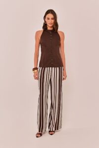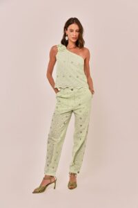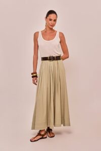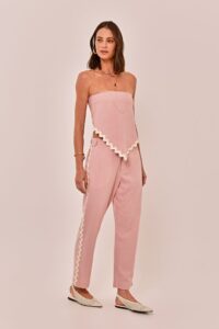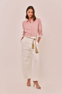 Entre os destaques, aparecem produções que exploram o contraste entre estrutura e leveza: vestidos fluidos, coletes matelassados e calças aladdin que combinam a peças de alfaiataria, saias mais ajustadas ao corpo e lenços amarrados em looks que enriquecem o styling e reforçam a atmosfera de viagem à beira-mar. Bordados manuais, franjas e tassels acrescentam textura e movimento, reforçando a sensação de liberdade e autenticidade.