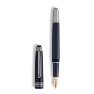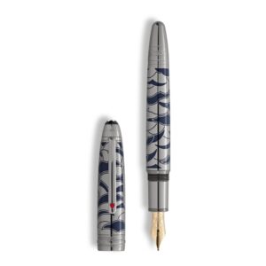 Meisterstück A Volta ao Mundo em 80 Dias Doué Classique Edition com corpo de resina azul escura preciosa polida e tampa revestida de rutênio, gravada com o padrão de fumaça e válvulas de pressão, e completada com um cartucho de trem a laser. Disponível como uma caneta-tinteiro com uma pena de ouro Au 750/18K, rollerball e esferográfica.