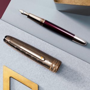 A tampa e o corpo da Meisterstück O Pequeno Príncipe Resina Preciosa Le Grand e da Meisterstück O Pequeno Príncipe Resina Preciosa Classique são feitos de resina preciosa polida burgundy, evocando a rosa, com acabamentos em ouro champagne. Imortalizado na pena artesanal de ouro 14k da caneta tinteiro, o Pequeno Príncipe remove as ervas daninhas do seu planeta, representando a noção de que o verdadeiro amor vem do investimento em cuidado com as pessoas, assim como o Pequeno Príncipe cuida de sua rosa e de seu planeta.