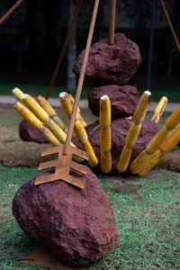Ao lado do palco é possível contemplar a obra da Luana Vitra, artista plástica, dançarina e performer, que mostra a relação entre os povos e as espécies na escultura Ferramenta para o fim da fome, criada com minerais, ferro e bronze.