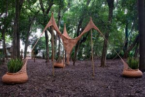 Na área do redário, o artista Ernesto Neto exibe a Teia do bicho tempo, quark!, obra que entrelaça diferentes mundos à ancestralidade brasileira e a ideais religiosos, por meio de elementos de algodão, bambu, terras e plantas.