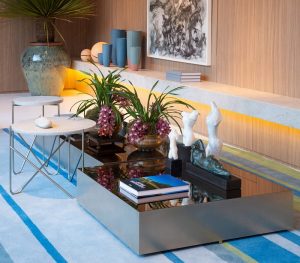 Destaques no mobiliário: mesa de centro Modi, inspirada no pintor Modigliani, com suas linhas sinuosas, textura de mármore nero em uma lapidação orgânica dão fluidez ao layout. Temos que enfatizar também a poltrona Lena, que da leveza e design ao ambiente.