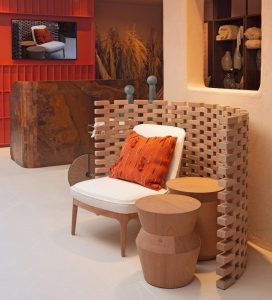 Destaques no mobiliário: mesa Milpa – com tampo retirado de uma fatia de árvore inteira, e os módulos Kadan pelo seu conforto e leveza.