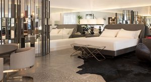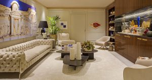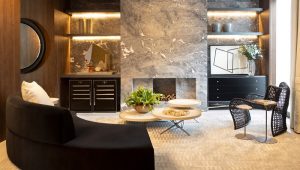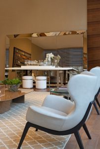 “Toda vez que pensamos em projetar um ambiente que se conecte com os inúmeros visitantes de uma mostra de decoração, especialmente as mais longas, entramos num grande processo de reflexão que nos faz analisar múltiplos perfis na tentativa de desenvolver traços que nos conectem a esses visitantes e que, por sua vez, os conectem ao nosso projeto”, contam os profissionais Renan Mutao, Ary Polis e Bianca Moraes. E, nessa edição da Mostra Artefacto, eles trazem uma pluralidade de estilos arquitetônicos, onde os elementos clássicos coordenados com mobiliário e obras de arte modernas estão posicionados em um espaço de cores neutras. O azul ultramar foi eleito para trazer a vibração da cor para o ambiente, e aparece em obras de arte e objetos decorativos. Nos revestimentos naturais destaque para o Legno de Macassar e o mármore Nero Serrano. A seda rústica em tom de pérola ilumina o ambiente e o couro neblina, que reveste o sofá, mimetiza com a tonalidade do painel laqueado de boiserie, deixando evidente o elegante capitonê do sofá. O resultado é um espaço cosmopolita, com originalidade nas composições, personalidade marcante, conforto e sofisticação capazes de chamar a atenção do mais jovem ao mais experiente cliente da marca.