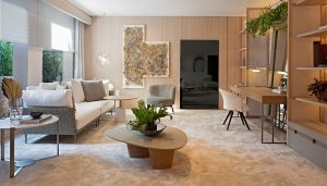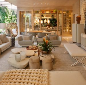 Em um espaço com 110 m2, Cymara e Camila Largura e Jacy Ebrahim criaram um ambiente capaz de encher os olhos do visitante. “Interpretamos o tema da Mostra com conforto, carinho e abraço, um ambiente de aconchego pronto para receber e conviver com que amamos”, conta Cymara. Para elas, o Essencial é a família, seja ela de sangue ou coração. Projetado em tons claros e uso de muito material natural, como linho, camurça e fibras, o espaço possui uma adega, área de home theater e homeoffice. Uma das surpresas é a mesa de jantar que pode ser usada, também, para jogo de bilhar. Ou seja, tudo pronto para atender todas as necessidades”, pontua Cymara.