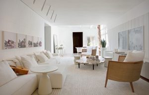 Destaques no mobiliário: Sofá Raja em couro natural Houston, a poltrona Lakor em seda Hassan offwhite e a poltrona Maros em veludo Hamburgo Sand.